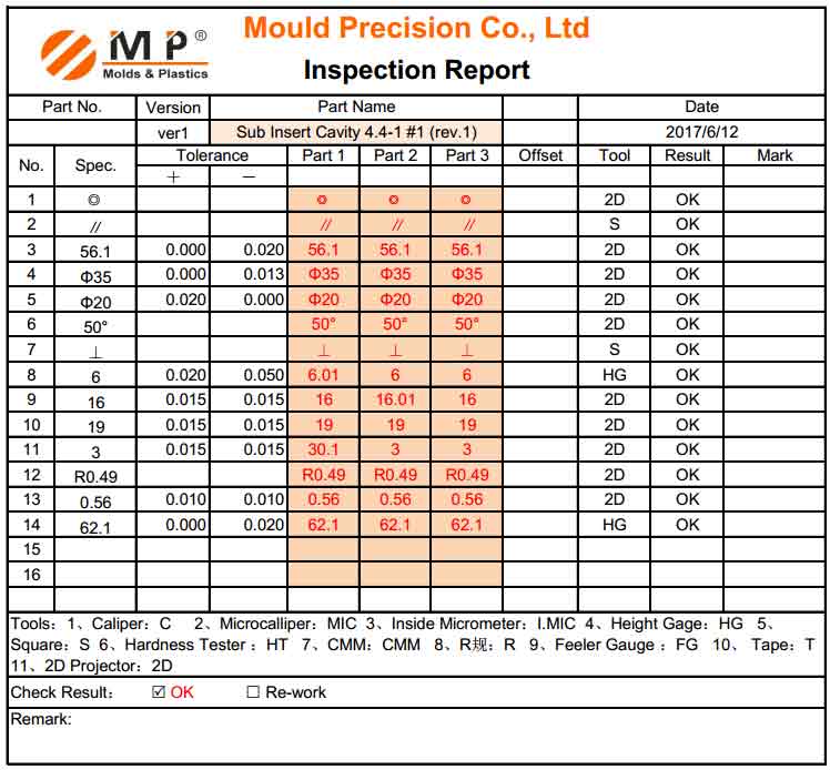The key is not only reach tolerance require, but also ensure it must be Parallel and Concentric. In order to assembly and moving well. The steel is S136, very good for high polishing. (Inspection Report of Core Pins.)